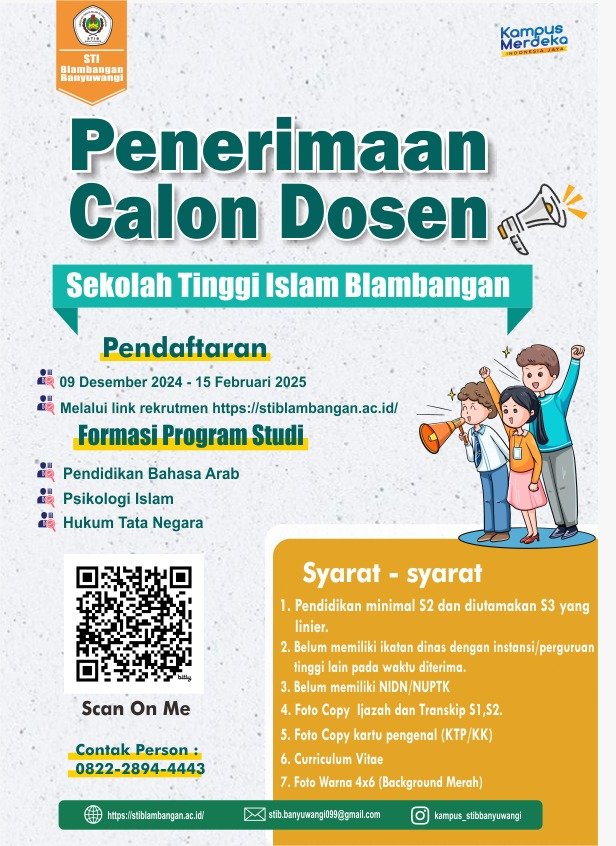 Sekolah Tinggi Islam Blambangan (STIB) Banyuwangi kembali menunjukkan komitmennya dalam pengembangan keilmuan di tingkat perguruan tinggi. Sebagai bagian dari upaya meningkatkan kualitas pendidikan, STIB membuka peluang bagi masyarakat Banyuwangi dan sekitarnya untuk berkarir sebagai tenaga pendidik (dosen).